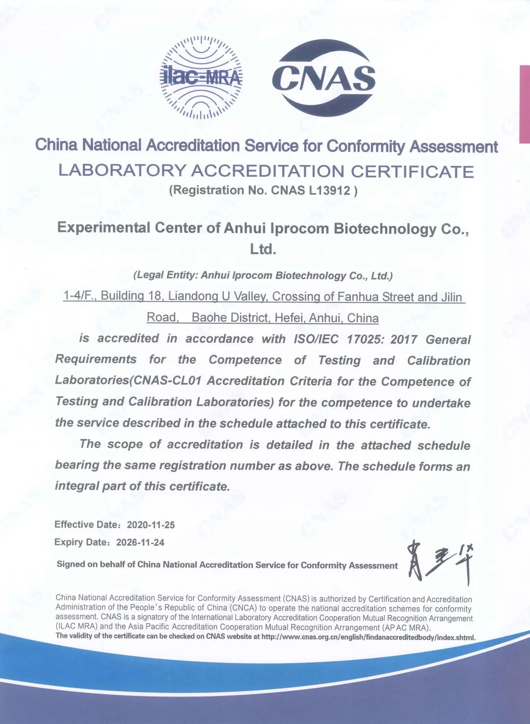经CNAS评定委员会最终评定,我司实验中心于2020年11月30日获得CNAS认可证书!