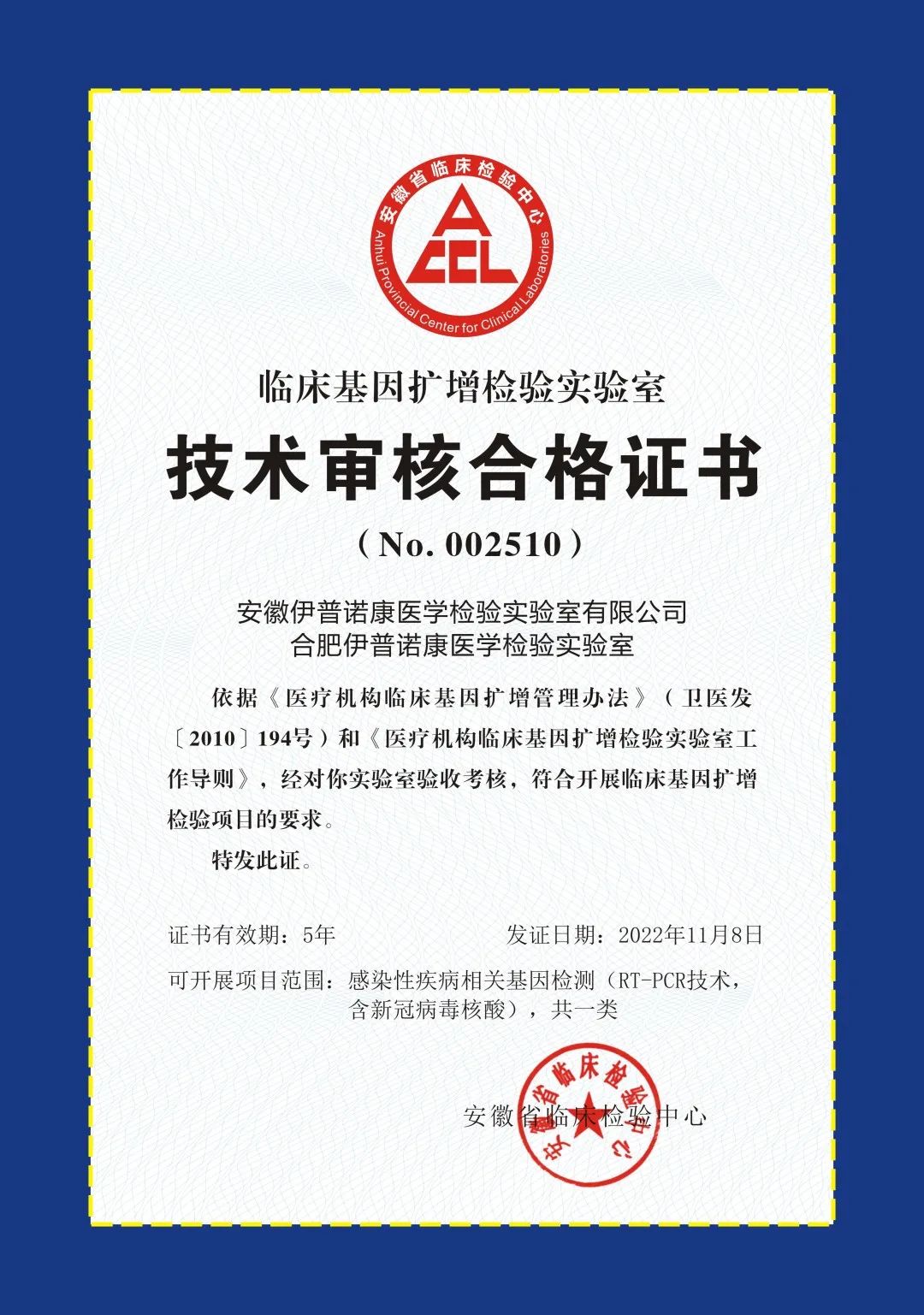 2022年10月以来,合肥市新冠疫情变得严峻,在全面抗击新冠肺炎的关键时刻,为贯彻落实省、市疫情防控常态化工作要求,满足人民群众应检尽检和愿检尽检的需求,合肥伊普诺康医学检验实验室(以下简称实验室)在取得《医疗机构执业许可证》之后,积极申报新冠病毒核酸检测能力认证,助力合肥市构筑疫情防控的坚固防线。11月10日,接安徽省新冠肺炎疫情防控应急综合指挥部办公室通知,实验室顺利通过省市级专家组验收,成为安徽省第三十一批具备新冠病毒核酸检测能力的医疗机构,取得由安徽省临床检验中心颁发的《临床基因扩增检验实验室技术审核合格证书》。